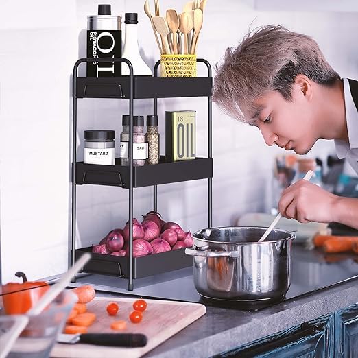 This versatile storage rack is perfect for organizing a variety of items, from toiletries and cleaning supplies in the bathroom to spices, jars, and utensils in the kitchen. Its spacious shelves offer ample storage space to keep your essentials neatly organized.